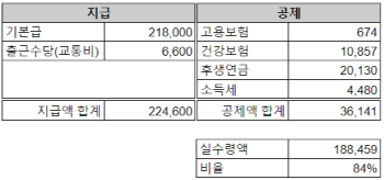 ※출근 수당(교통비)은 임의 설정 가격 ※미혼, 부양가족 없음